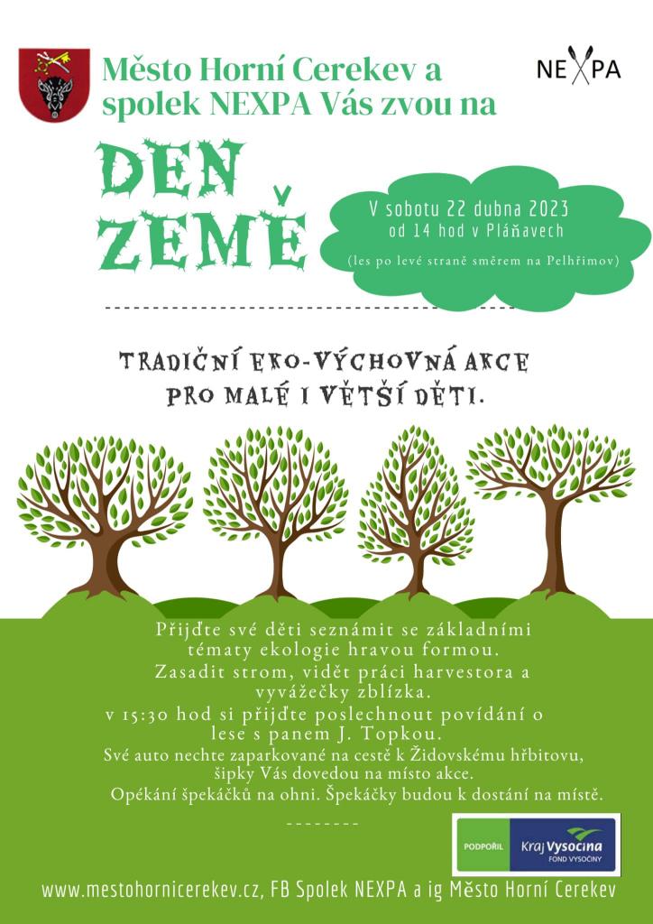 V sobotu 22. dubna pořádá město Horní Cerekev ve spolupráci se spolekem NEXPA tradiční eko-výchovnou akci. Sejdeme se ve 14 hodin v Pláňavech. Děti se hravou formou seznámí se základními tématy ekologie, zasadí si strom a prohlédnou si práci harvestoru a vyvážečky zblízka. ![]()