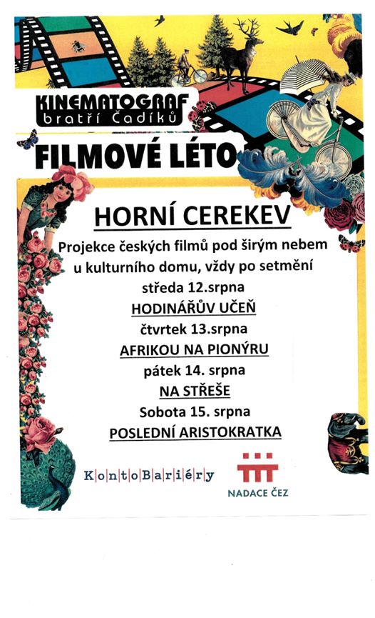 Město Horní Cerekev ve spolupráci s KINEMATOGRAFEM bratří Čadíků připravuje letní kino u kulturního domu. Seznam filmů je uveden na plakátě v příloze. Začátek promítání je vždy po setmění.