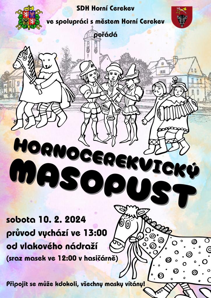 SDH Horní Cerekev za podpory města Horní Cerekev pořádá tradiční masopustní průvod městem. Zapojit se může každý. Sraz masek ve 12:00 v hasičské zbrojnici.