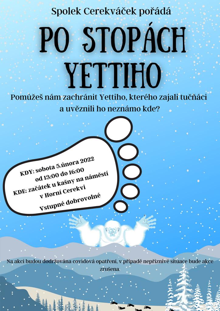 Spolek CEREKVÁČEK z.s. pořádá zábavnou akci pro děti od 4 do 12 let. Na několika stanovištích budou děti plnit různé úkoly tak, aby na konci stezky zachránili YETTIHO.