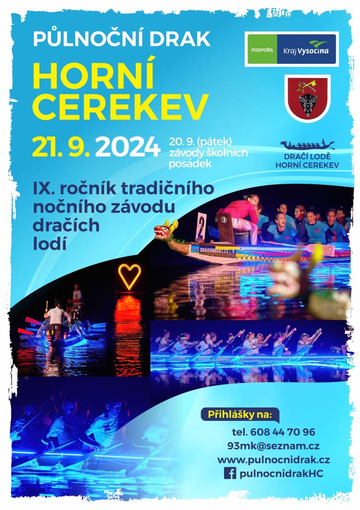 Již tento víkend proběhnou v Horní Cerekvi závody dračích lodí. V pátek můžete přijít podpořit juniorské posádky, v sobotu pak posádky dospělých závodníků v kategoriích ŽENY/FUN/SPORT. Těšit se můžete na spoustu zábavy, bohaté občerstvení, skákací hrad, atraktivní noční závod a na závěr ohňostroj.