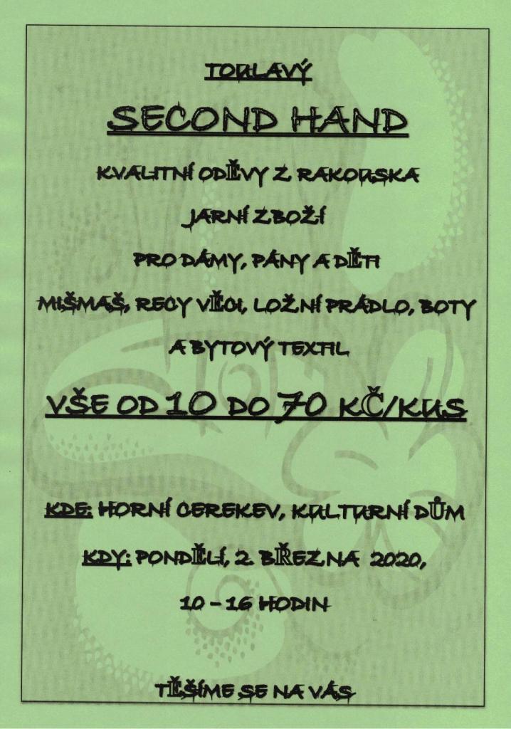 V pondělí 2.3.2020 od 10 do 16 hodin se uskuteční v Kulturním domě v Horní Cerekvi prodejní akce značkového second-handu z Rakouska. Po celý den Vám bude nabízen široký sortiment dámského, pánského a dětského kvalitního oblečení, bot, bytového textilu, ložního prádla. Vše od 10-ti do 70-ti Kč/kus. Přijďte si oživit šatník jarní módou levně a kvalitně. Všichni jste srdečně zváni!